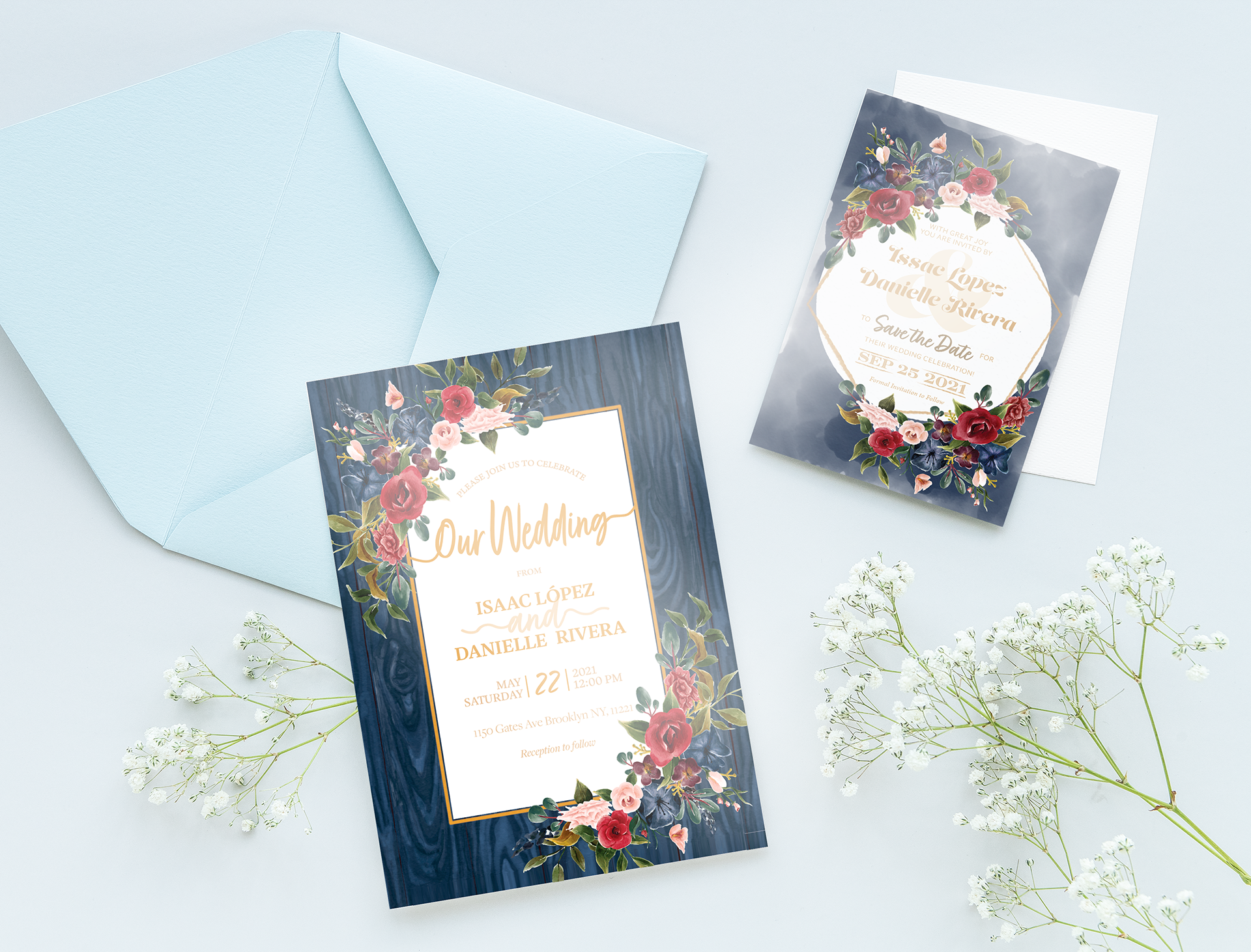 They had a very clear idea of what the color scheme and style of their invitation would be. They sent me examples and I used them as my inspiration for the design and illustrations.